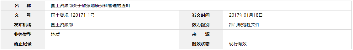 本通知有效期為8年。本通知自發布之日起施行,《國土資源部關于加強地質資料匯交管理的通知》(國土資發〔2010〕32號)、《國土資源部關于印發<地質資料匯交監管平臺建設工作方案>的通知》(國土資發〔2011〕78號)、《國土資源部辦公廳關于進一步加強原始地質資料管理的通知》(國土資廳發〔2012〕57號)、《關于進一步做好地質資料保護登記管理工作的通知》(國土資發〔2007〕153號)、《關于做好石油、天然氣、煤層氣、放射性礦產地質資料和海洋地質資料管理有關工作的通知》(國土資發〔2004〕53號)、《國土資源部辦公廳關于加強探礦權人放棄區塊范圍地質資料匯交管理的通知》(國土資廳發〔2011〕51號)、《關于報送地質資料及管理信息的通知》(國土資廳發〔2007〕148號)、《國土資源部辦公廳關于做好地質資料匯交監管平臺建設有關工作的函》(國土資廳函〔2011〕1079號)、《關于<無證勘查地質資料利用等問題的請示>的復函》(國土資廳函〔2005〕624號)、《關于非保護期內國家出資勘查開發形成的地質資料利用問題的復函》(國土資廳函〔2006〕34號)、《國土資源部辦公廳關于地質資料與礦產有關信息社會化服務有關問題的復函》(國土資廳函〔2008〕588號)、《關于印發<加強地質資料社會化服務的若干規定>的通知》(國土資發〔2005〕215號)、《關于建立健全地質資料網絡服務體系的通知》(國土資發〔2006〕98號)、《關于印發〈成果地質資料電子文件匯交格式要求〉的通知》(國土資發〔2006〕210號)、《關于印發〈油氣勘探與開發地質資料立卷歸檔要求〉的通知》(國土資發〔2006〕266號)、《關于印發〈油氣成果地質資料電子文件制作匯交細則〉和〈油氣成果地質資料計算機著錄細則〉的通知》(國土資發〔2007〕237號)同時廢止。