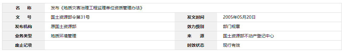 第二十五條 地質災害治理工程監理資質單位,對承擔的監理項目,應當在監理合同簽訂后十日內,到工程所在地縣級國土資源管理部門備案。