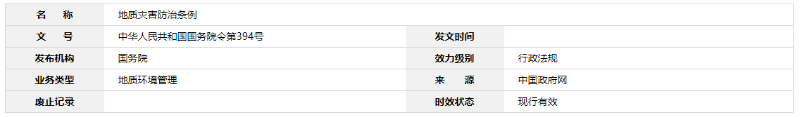 《地質災害防治條例》已經2003年11月19日國務院第29次常務會議通過,現予公布,自2004年3月1日起施行。