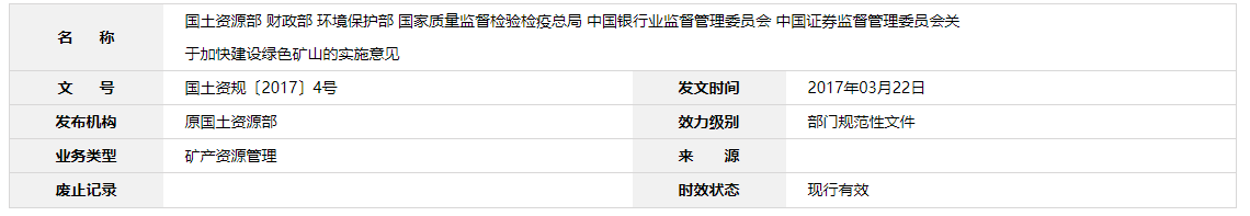 (七)實行礦產資源支持政策。對實行總量調控礦種的開采指標、礦業權投放,符合國家產業政策的,優先向綠色礦山和綠色礦業發展示范區安排。