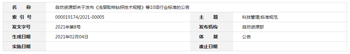 自然資源部關于發布《淺層取樣鉆探技術規程》等10項行業標準的公告