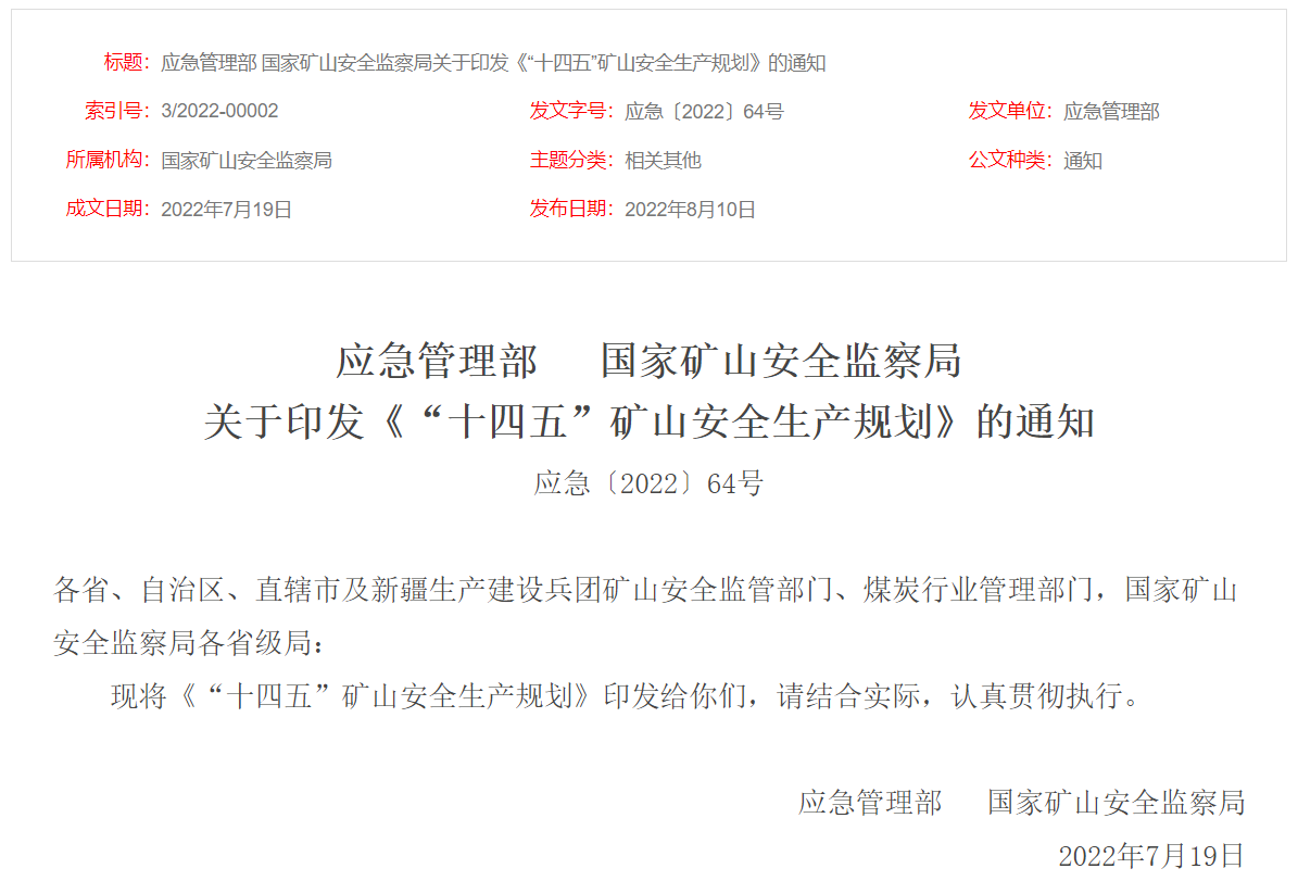 到“十四五”末,礦山安全法規標準體系更加完備、安全生產責任體系更加健全、安全預防控制體系更加科學、安全監管監察體制更加完善、信息化智能化水平大幅提高、基礎保障能力明顯增強、監管監察效能顯著提升,礦山安全綜合治理效能取得重大進展,事故總量持續下降,重特大事故得到有效遏制。