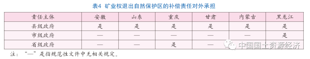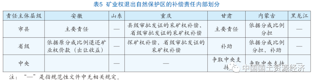 在補償責任的對外承擔上(表4),除黑龍江省、重慶市分別將市級政府、省級政府添加為責任主體外,各地普遍由縣級政府向礦業權人支付補償。在補償責任的內部劃分上(表5),安徽省和甘肅省規定由市縣承擔籌措補償資金的主要責任,內蒙古自治區規定自治區、市、縣依據分成比例分擔補償責任,山東省和黑龍江省并無明確規定。重慶市則按照審批發證權限和礦業權類型予以區分,縣級審批發證的采礦權由市縣補償,省級審批發證的采礦權由省市縣分擔補償,探礦權由省級補償。