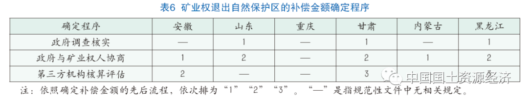 在補償金額確定程序上(表6),核心環節是由政府與礦業權人協商。山東、甘肅、黑龍江三省還規定在此之前要先由政府對補償金額予以調查核實,安徽、甘肅、黑龍江三省規定在協商無法達成一致的情形下要由第三方機構進行核算評估,重慶市則未對補償金額的確定程序作出明確規定。