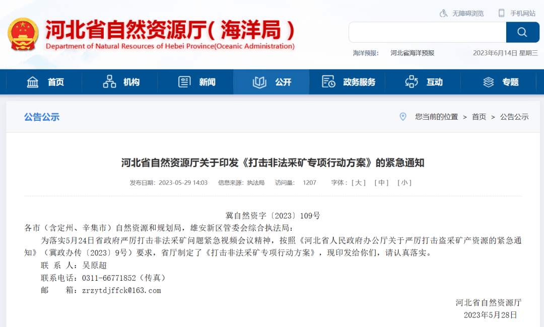 2023年5月29日,河北省自然資源廳發(fā)布《打擊非法采礦專項(xiàng)行動方案》(冀自然資字〔2023〕109號,以下稱“方案”),要求利用1個(gè)月時(shí)間,集中查處一批違法違規(guī)采礦案件,打擊懲治一批違法分子,修復(fù)治理一批非法礦山(礦點(diǎn)),實(shí)現(xiàn)礦產(chǎn)資源違法違規(guī)問題“動態(tài)清零”。
