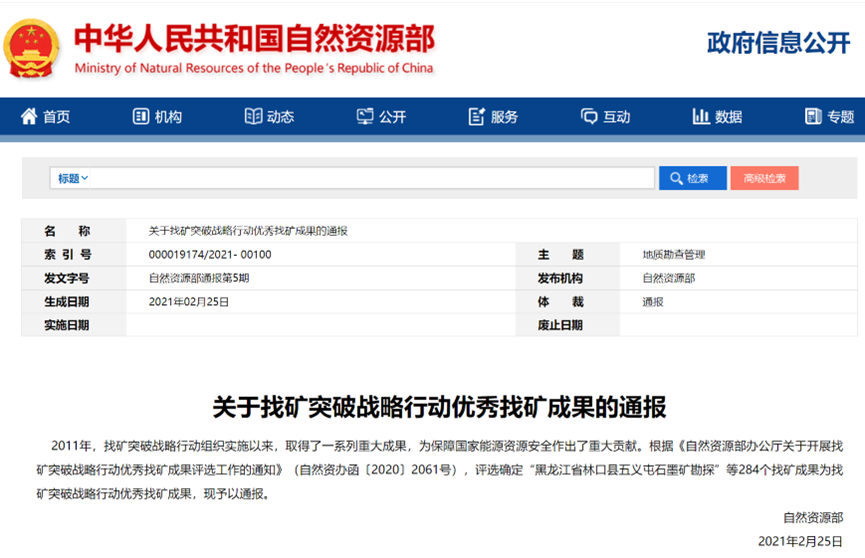 2011年發(fā)起的找礦突破戰(zhàn)略行動(dòng)取得了一系列重大成果,為保障國家能源資源安全作出了重大貢獻(xiàn)。2021年2月25日自然資源部發(fā)布通報(bào),評選確定“黑龍江省林口縣五義屯石墨礦勘探”等284個(gè)找礦成果為找礦突破戰(zhàn)略行動(dòng)優(yōu)秀找礦成果。