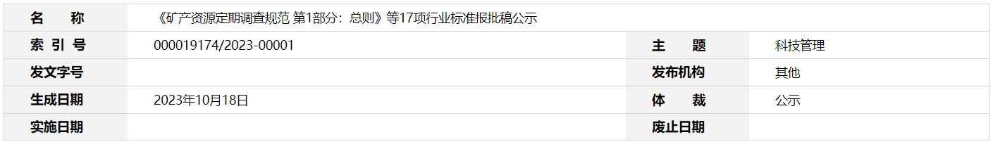 《礦產(chǎn)資源定期調(diào)查規(guī)范 第1部分:總則》等17項行業(yè)標(biāo)準(zhǔn)報批稿公示