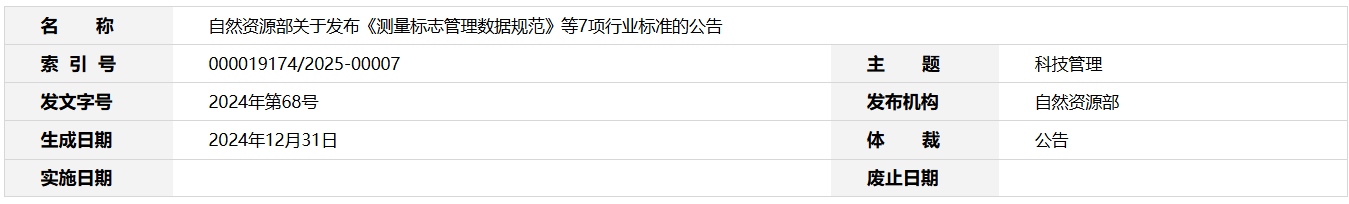 自然資源部關(guān)于發(fā)布《測量標(biāo)志管理數(shù)據(jù)規(guī)范》等7項行業(yè)標(biāo)準(zhǔn)的公告