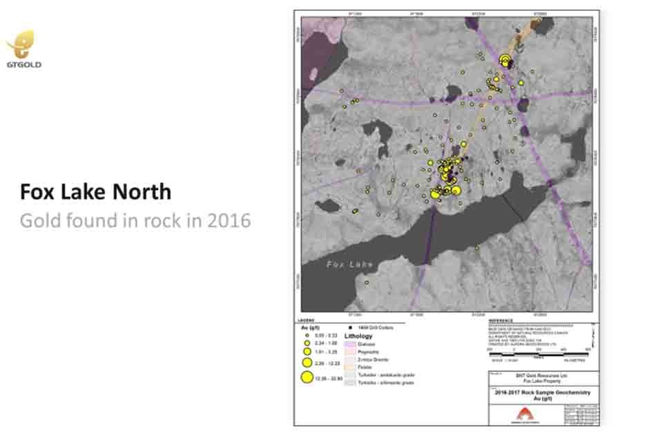地球化學(xué)采樣:(Aurora Geosciences)采樣范圍覆蓋 Fox Lake 南北兩處金礦化點(diǎn)。