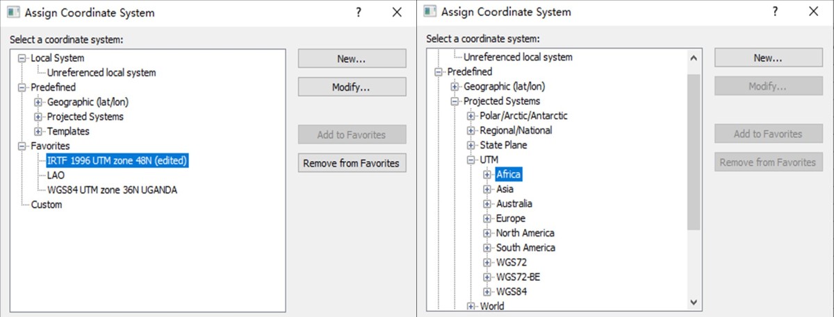 2018年筆者去非洲某國開展礦產勘察工作,該國礦證文件所使用坐標系統的橢球參數未知。那么如何轉換坐標系統得以利用GPS開展工作,尤其是判斷礦點是否在探礦范圍內,以防止因為不同坐標系統的原因而遺漏礦點或者工作設計超出礦證范圍?目前,有一些軟件可以提供大多數國家的坐標系統轉換,例如Surfer、GlobalMapper等軟件。該國所用坐標系統筆者搜遍常用地礦軟件均未發現,最終只能到ITRF網站上查詢相關的橢球參數數據,而后在Surfer軟件中自建坐標系統(圖1左Favorites第一行,就是自己創建的一個坐標系)。后期工作時結合礦證文件所示地形地貌標志,并經工作現場核實發現,在簡單應用Surfer坐標系統庫中的ITRF1996 UTM 48N,則理論點和實際位置存在大于500米的誤差,而自己創建的坐標系最終較好地實現了與當地坐標系的轉換和匹配,誤差小于10米。