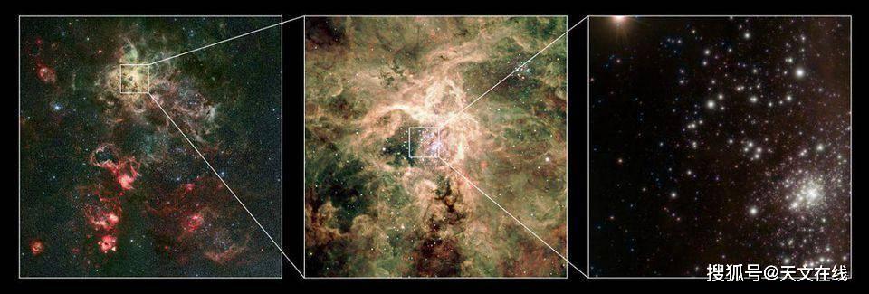 馬賽克中有蜘蛛星云:整個局部星系群中最大的恒星形成區域。