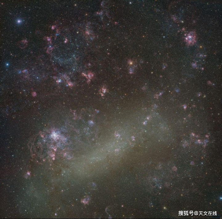 圖解:大麥哲倫星云是上世紀最近超新星的所在地。這塊粉色區域不是人造的,它很可能是由重力相互作用和潮汐力引發的,是電離氫和活躍恒星形成的標志。值得注意的是,把這張傳統的業余長曝光圖片與西爾·奧斯特拉爾團隊拍攝的照片相比,它缺少了太多細節。圖源:JESÚS PELÁEZ AGUADO