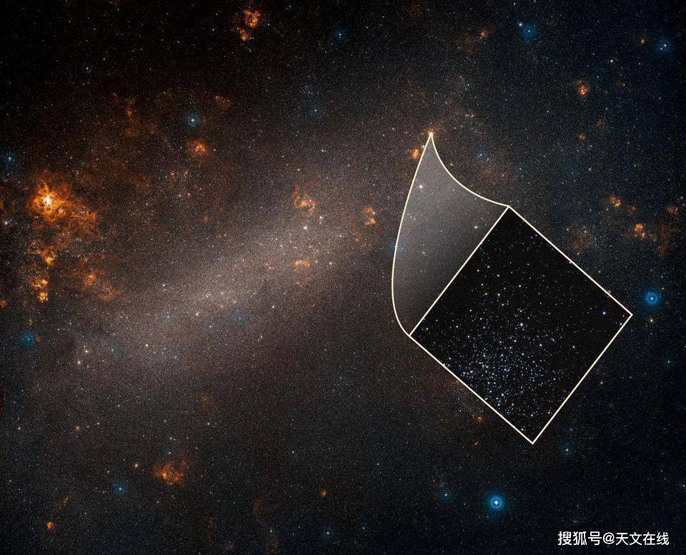 圖解:這張大麥哲倫星云圖片由數字化巡天項目拍攝,該專業項目使用了各種各樣的望遠鏡,觀測范圍涵括整個天空。小的,高分辨率的插圖是特定球狀星團的恒星,這個星團是大麥哲倫星云的衛星。和西爾·奧斯特拉爾團隊拍攝的業余圖像相比,專業照片信息量較小,細節較少。圖源:NASA, ESA, A. RIESS (STSCI/JHU), AND PALOMAR DIGITIZED SKY SURVEY