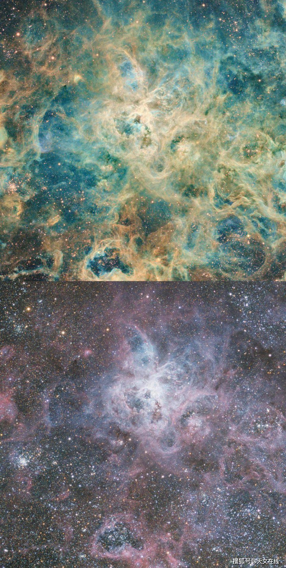 圖解:西爾·奧斯特拉爾團隊作品:蜘蛛星云的大部分區域,局部星系群的最大恒星形成區。在上面那張圖里,你可以看到氫氣,硫磺和氧氣存在的痕跡,它們展現了大麥哲倫星云豐富的氣體和等離子體結構。在下面那張圖里,你可以看到RGB色彩合成,這代表了在新形成的年輕恒星中的反射和星云發散。 圖源:CIEL AUSTRAL