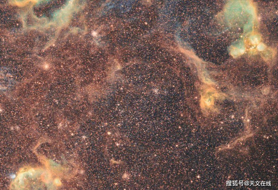 圖解:盡管遠離銀河系的主平面(那里恒星數量最多),基礎濾光鏡(上圖)和RGB顏色(下圖)仍然顯示了氣體,星塵,反射和發散的特征,并且呈現了多樣的要素。在附近的宇宙空間中,大麥哲倫星云是恒星形成最活躍的星系之一,像圖片所示的區域展現了恒星形成。圖源:CIEL AUSTRAL