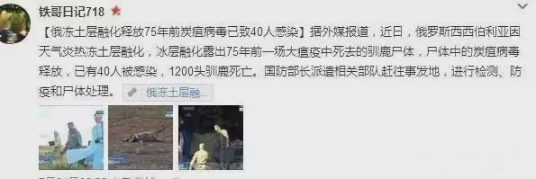 西伯利亞的凍土層融化了,冰層融化露出了75年前一場大瘟疫中死去的馴鹿尸體,而這個馴鹿尸體中含有的炭疽病毒被釋放,導致了2300多頭馴鹿感染死亡。