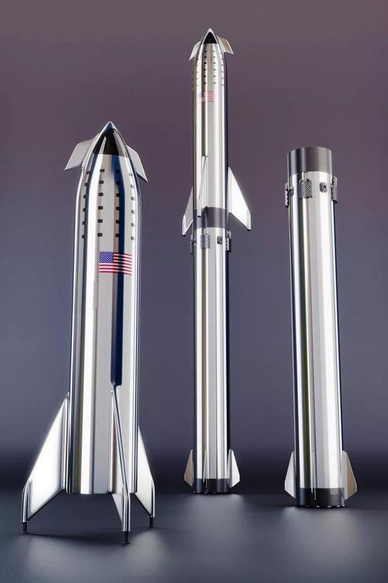 SpaceX將推出星際飛船(左),超重型火箭助推器(右),一個集成的星際-超重型發射系統(中)