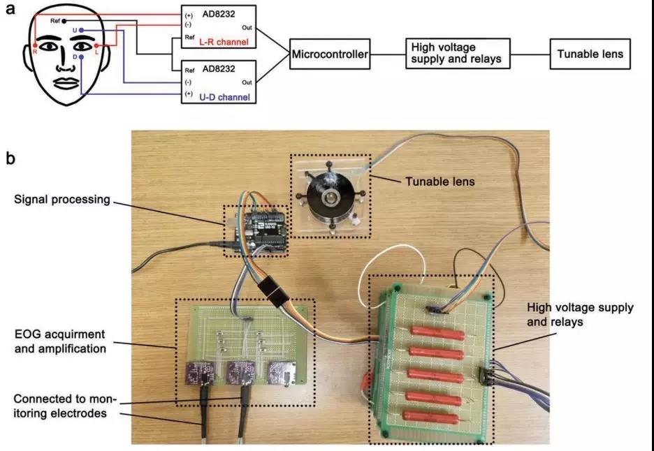加州大學圣地亞哥分校的研究人員開發了一種柔軟的機器鏡片,操作者可以通過眨眼和眼部肌肉運動來控制鏡頭。當操作者眨眼兩次時,鏡片會將調換焦距,如果向左、向右、向上或向下看,鏡片則將跟隨眼球的運動,切換到不同的方向(如下圖)。