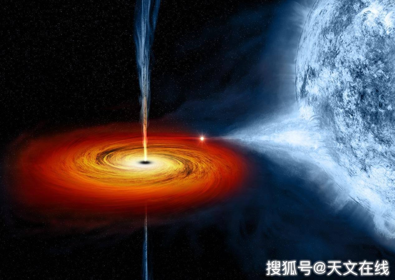 圖解 : 一位藝術家繪制的名為天鵝座X-1的黑洞。他是由一顆大恒星的塌陷而形成的,形成之后從旁邊的藍星上吸入物質。