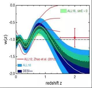 2017年我們利用最新的天文觀測(cè),利用重子聲波振蕩,紅移畸變等等,重建了暗能量隨視線的演化歷史,可以明顯看到它不是等于負(fù)1,不是一個(gè)常數(shù),而是隨著時(shí)間而演化的。