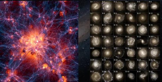 我們通過(guò)數(shù)字模擬得到的宇宙形成演化。右圖為數(shù)字模擬,已經(jīng)和我們今天觀測(cè)到的星系非常接近了,有各式各樣形態(tài)的星系,橢圓星系、漩渦星系等等。因此,暗物質(zhì)理論能夠很好的滿足今天的觀測(cè)。