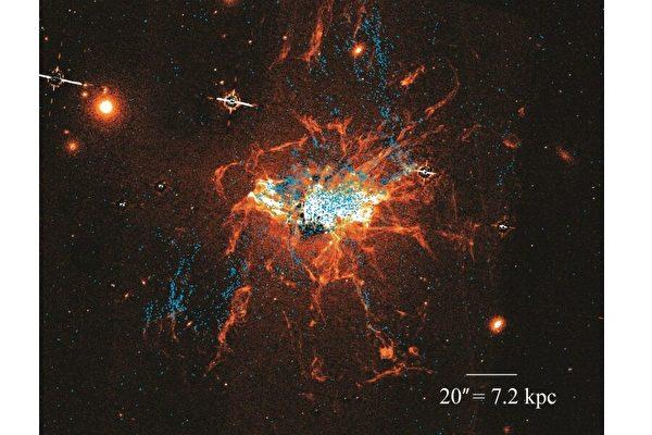 這份研究提供的圖片上可以看到,這些較“年輕”的球狀星團與復雜細絲網狀結構的冷氣體有著密切的聯系。研究人員由此推斷這些星團是在延伸到巨型星系外圍的冷氣體中誕生。