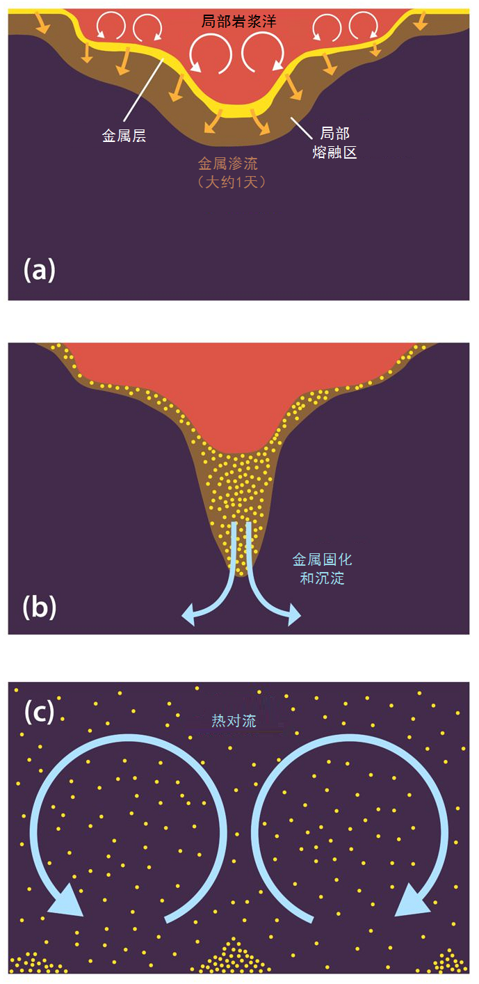 理論的核心是提出地幔存在一層薄的“瞬態(tài)”區(qū)域,在此處地幔淺部發(fā)生熔融,而深部呈固態(tài)。研究人員發(fā)現(xiàn),該區(qū)域具有獨(dú)特的動力學(xué)特征,能夠有效地捕虜落下的金屬組分并將它們緩慢地攜往地幔其他部分。