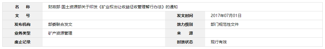 根據《國務院關于印發礦產資源權益金制度改革方案的通知》 (國發 C 2017 J 29號),財政部、國土資源部制定了《礦業權出讓 收益征收管理暫行辦法)) (見附件),請遵照執行。如有問題,請 及時告知。現將有關事項通知如下: