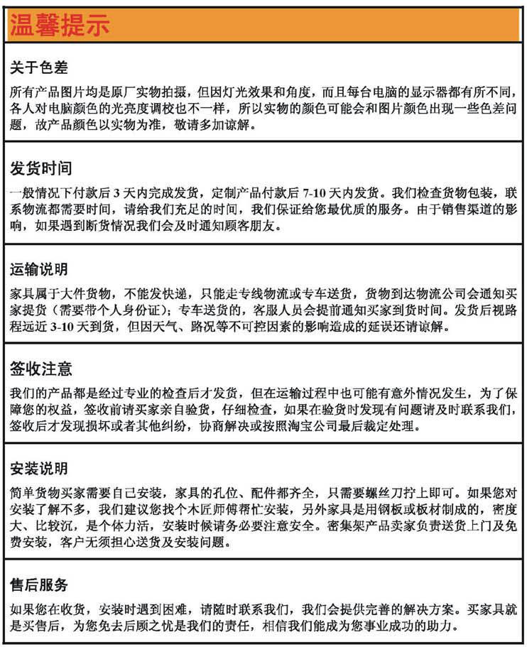 我們的產品是經過管理人員的仔細質檢后才發貨的,我們保證產品出廠時一定是完好無損的,由于家具產品的特殊性,以及長途物流原因,收件時,請您務必開箱驗貨后,再簽收,如發現損壞情況,請拒收,并立即聯系客服,我們接受退貨和重新補發貨物,若您先簽收后,在發現貨物損壞,請恕我們無法接受退貨或換貨,敬請諒解。