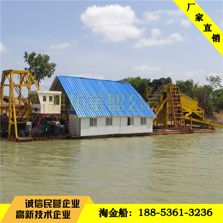 淘金船、淘金設備選礦經滾筒篩篩分后,5mm~15m的礦物料進入大顆粒金選礦槽內選礦,調整好溜槽的角度、水流速,用進口三菱金氈回收大顆粒金。