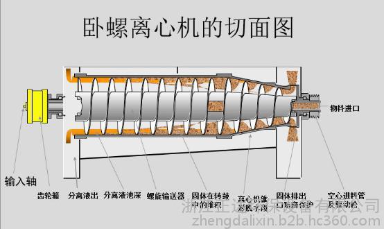 當混合液體有進料口進入高速旋轉的轉鼓體內腔后,混合液體中比重較大的固性物,在離心力的作用下,迅速陳江倒轉鼓內壁,被螺旋推料器從固相出口排出轉鼓體外;同時比重較小的液相則在離心力的作用下形成內層液環,通過液相溢流口排出轉鼓體外。轉鼓與螺旋推料器同時高速運轉,由于兩者之間存在一定的轉速差,使得沉降在轉鼓壁上固性物不間斷地被螺旋推料器推送至出液口排出,整個分離過程連續進行。